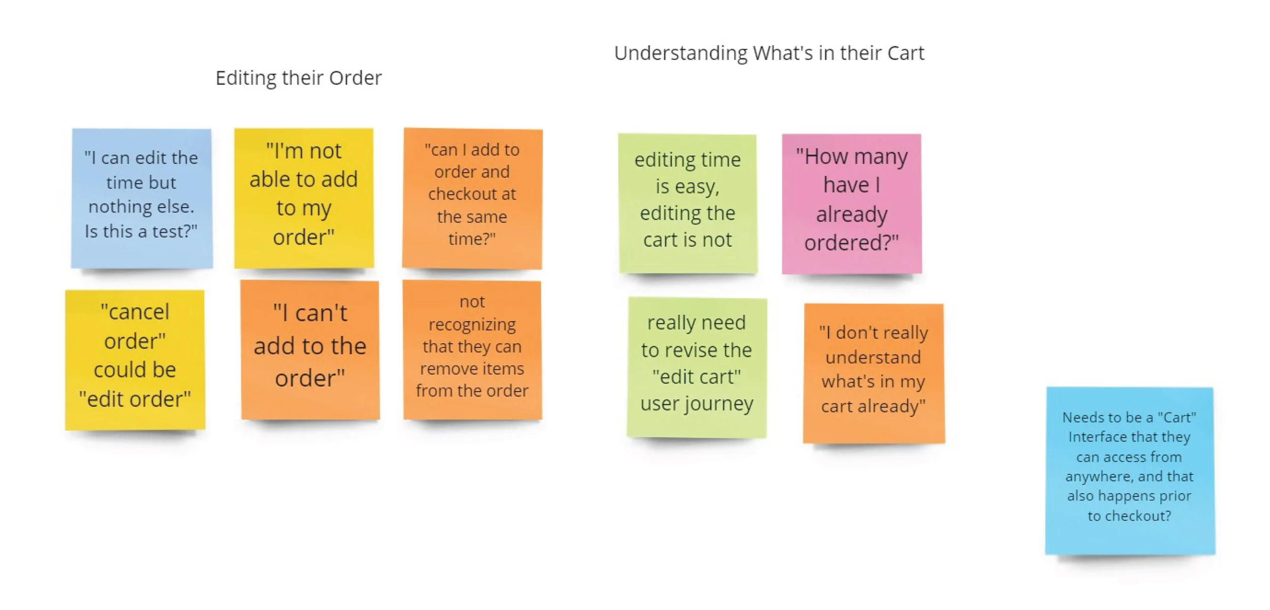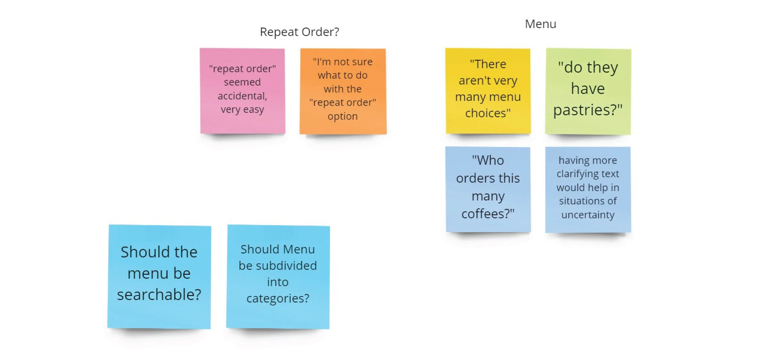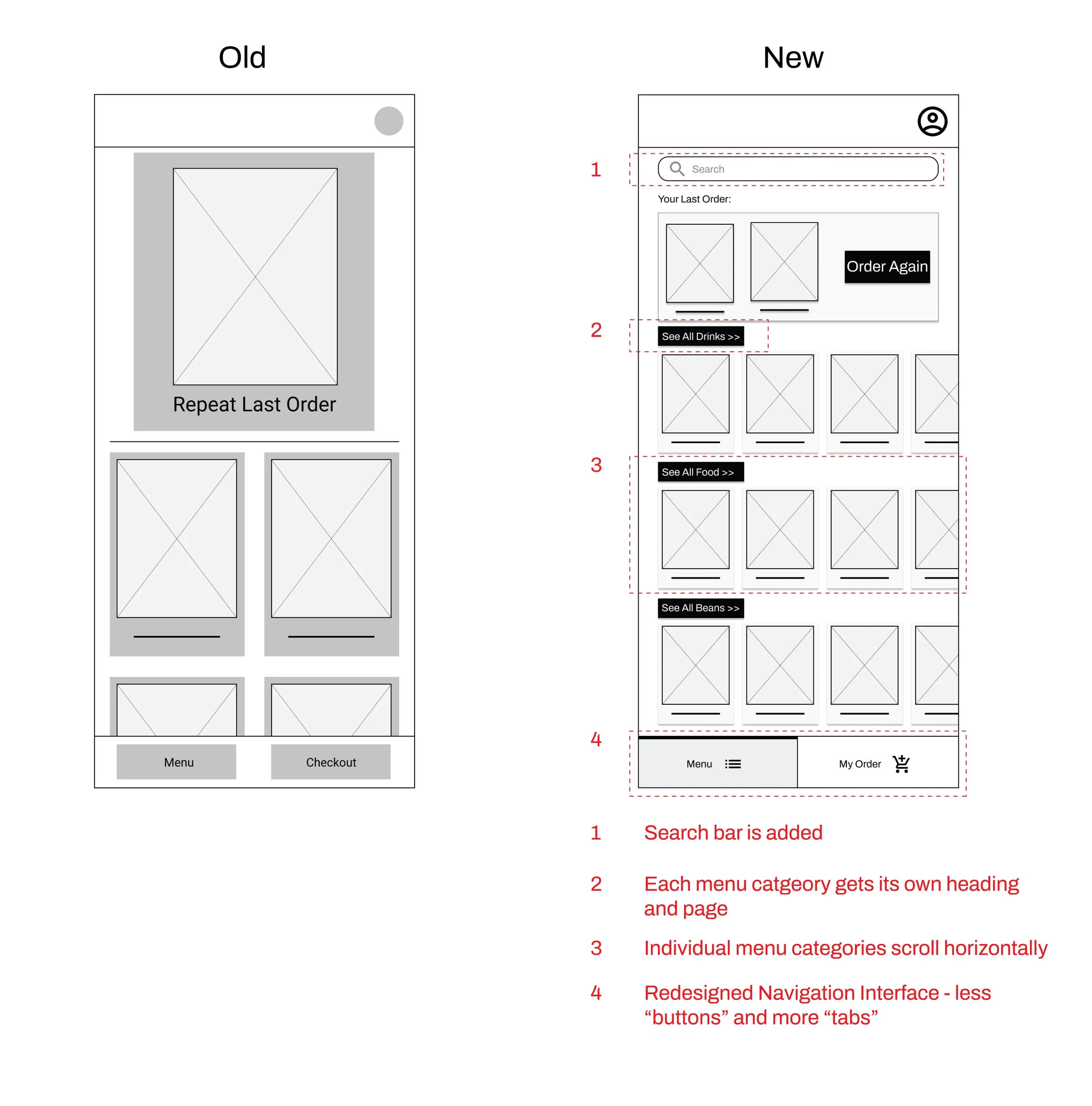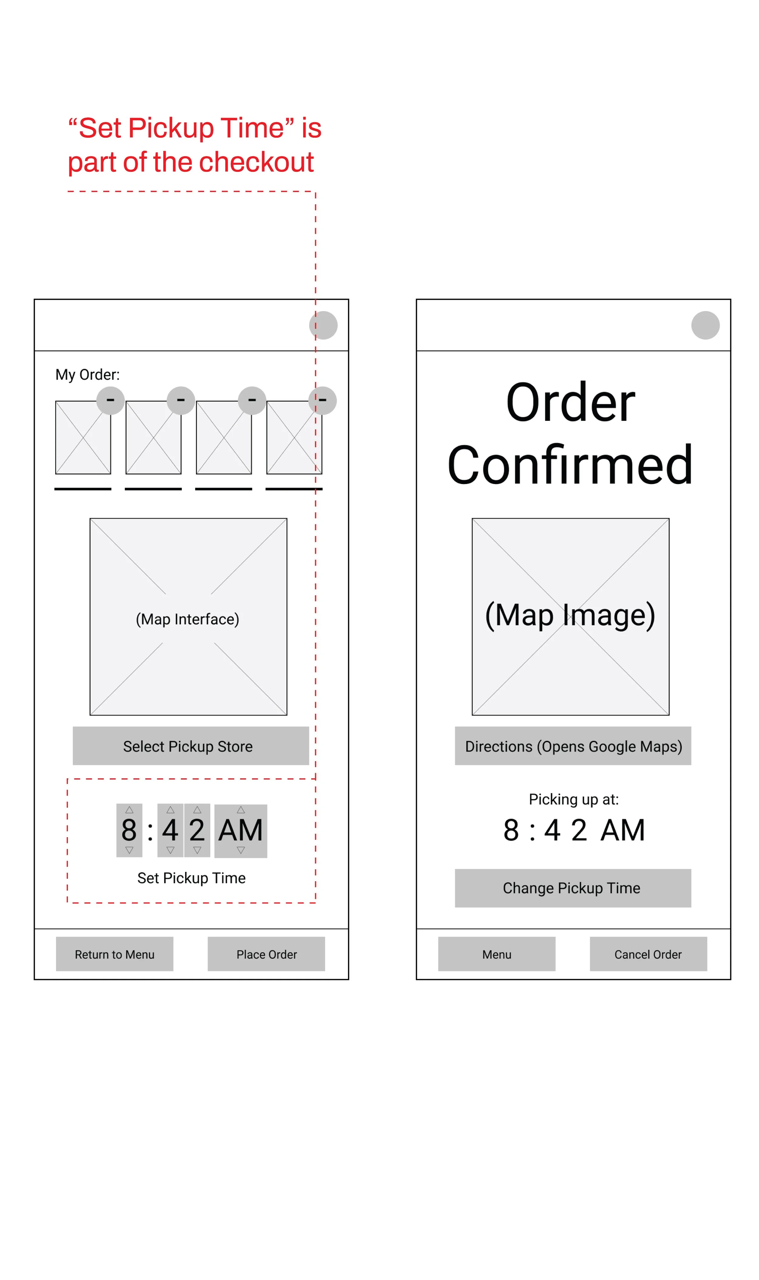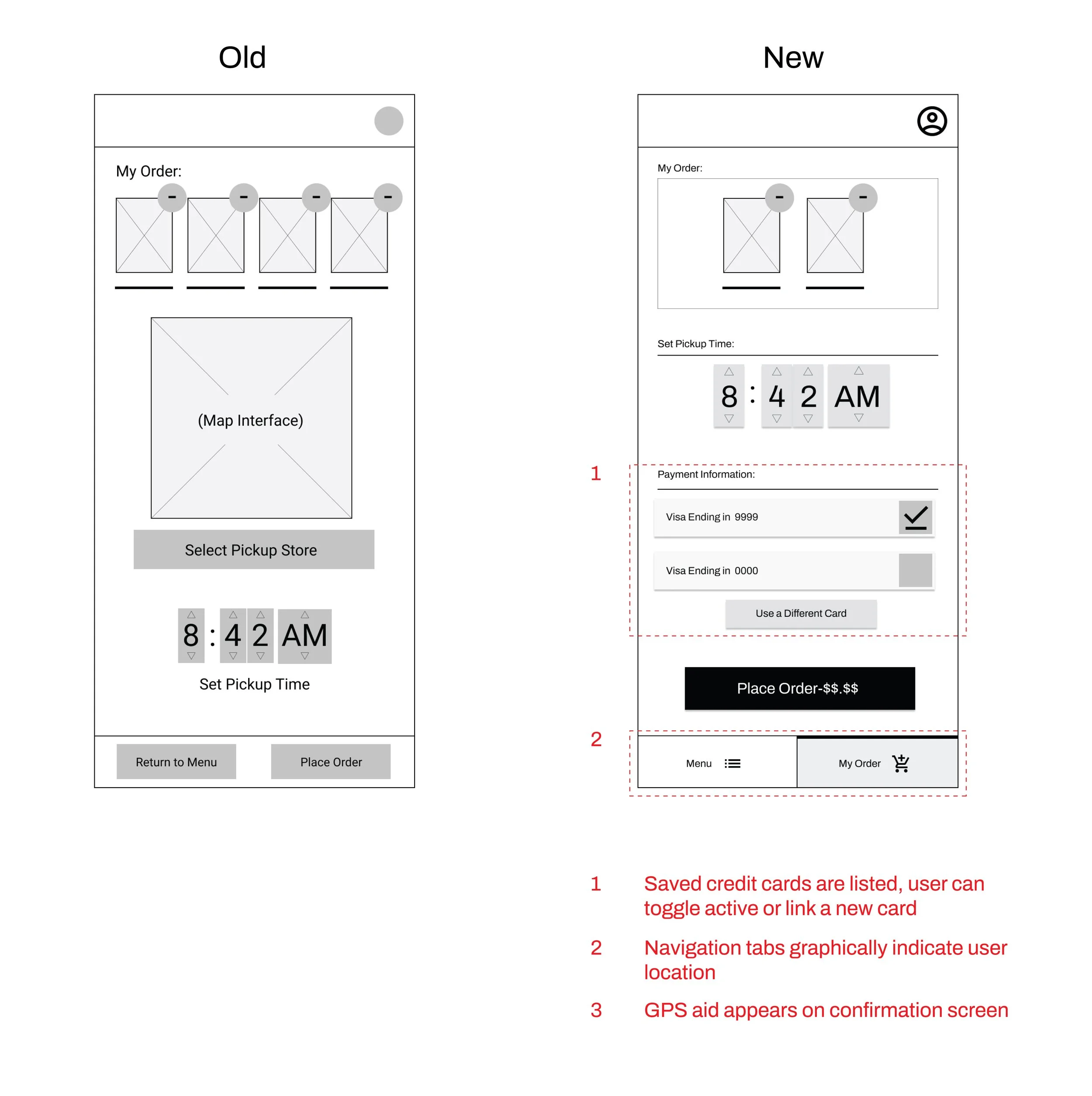 Initial usability studies indicated major concerns including that users didn’t know what was in their cart, and that they had difficulty understanding payment options. In the second round of usability studies, users weren’t able to navigate menus efficiently, and were slightly confused about what they were supposed to do immediately after opening the app.