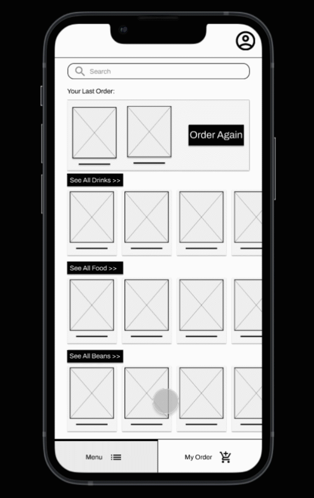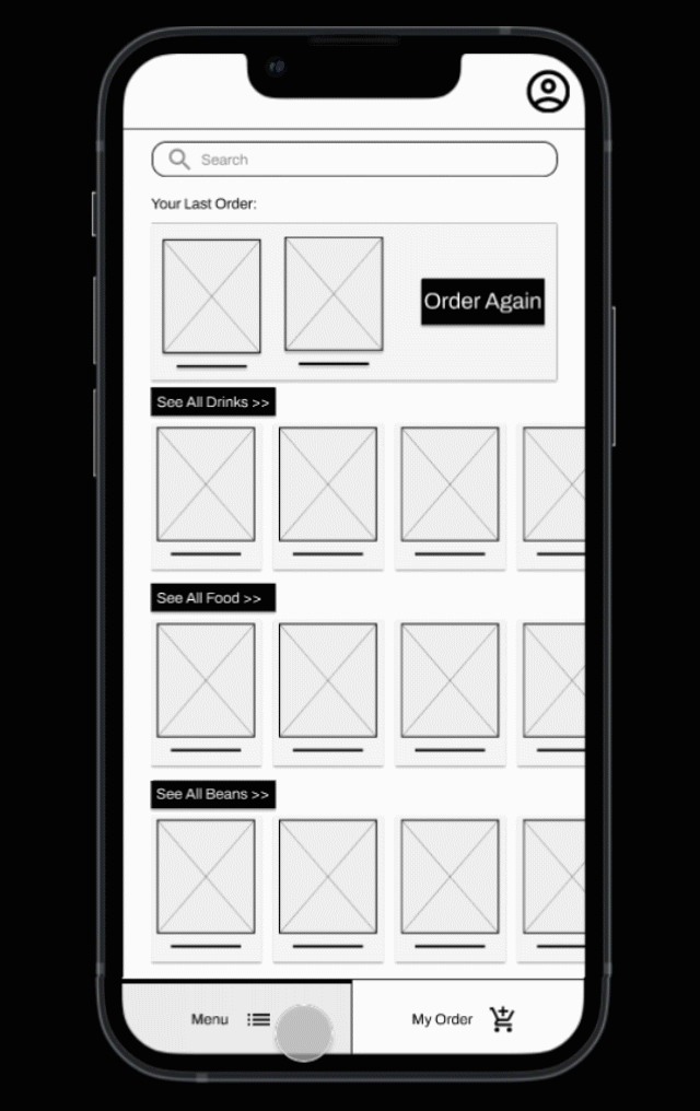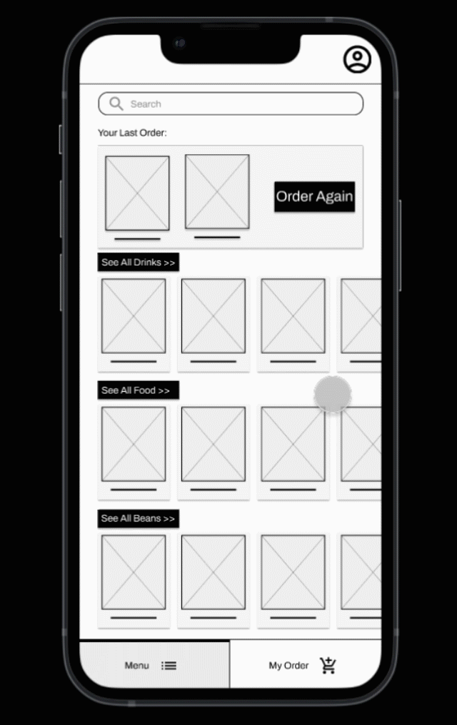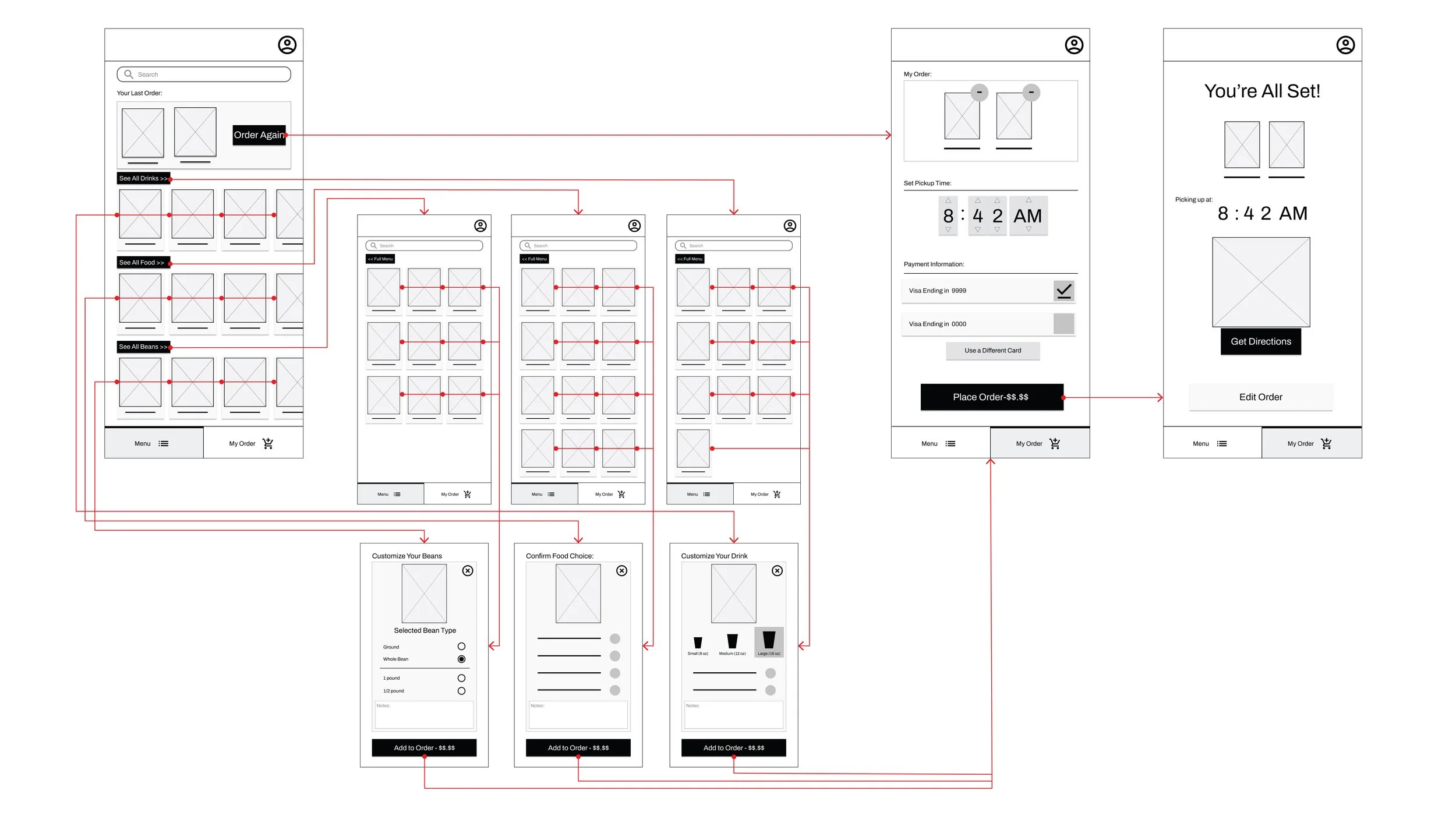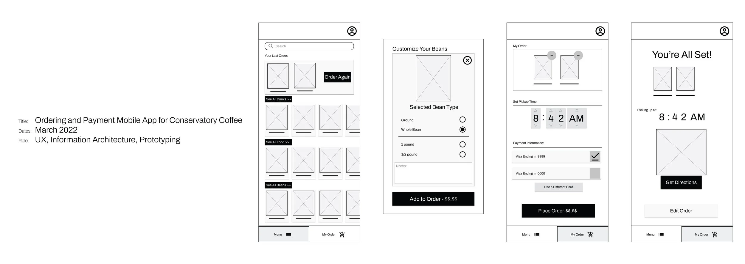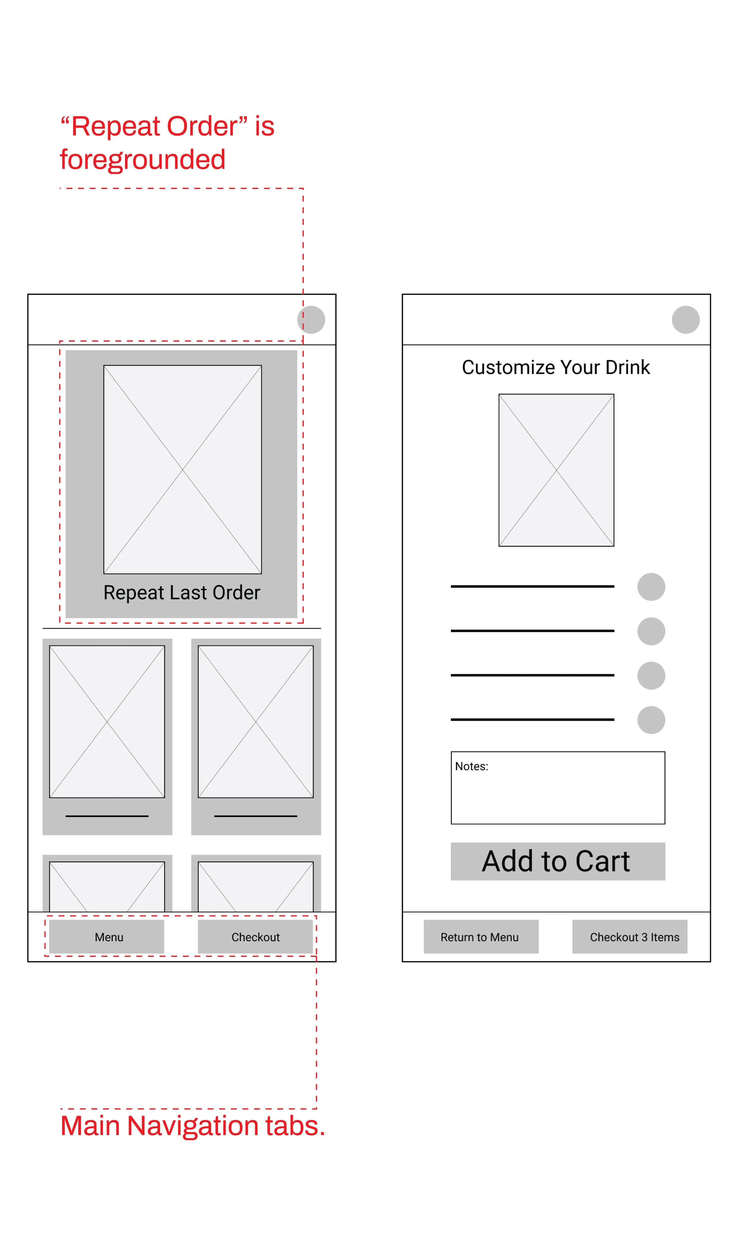 One big idea moving from the research phase into wireframing was the necessity for a “Schedule Pick-Up” feature. A second was the “Order Again” feature - especially important for users who are stopping by Conservatory Coffee as part of their regular, hurried, morning routine and tend to order the same thing every day.